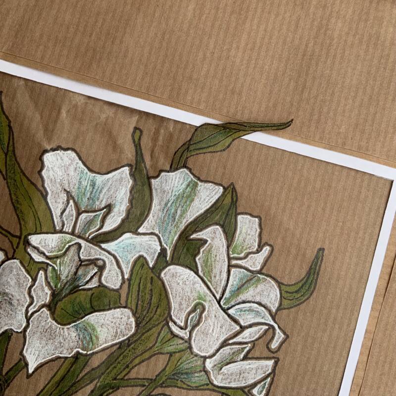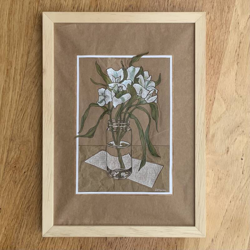 Witte Alstroemeria | gered papier | fineliner marker potlood | A4 | inclusief lijst | 175,- | Contact