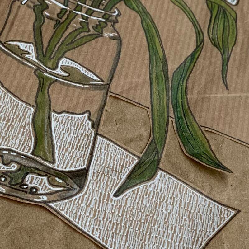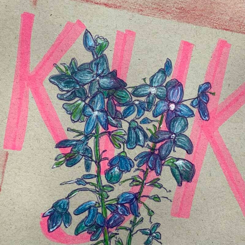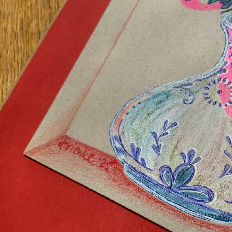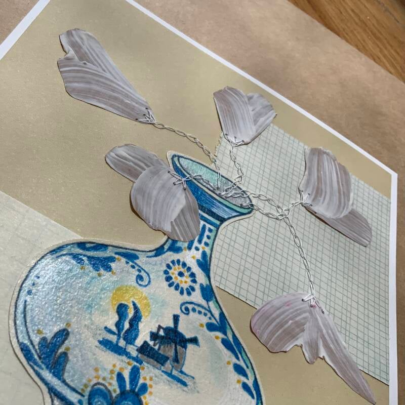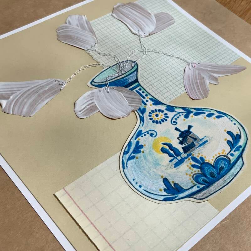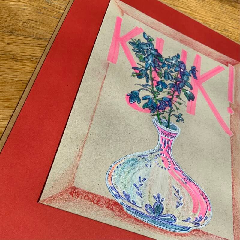 Ridderspoor in oud vaasje | gered papier en karton | balpen marker potlood | A4 | 50,- | Contact