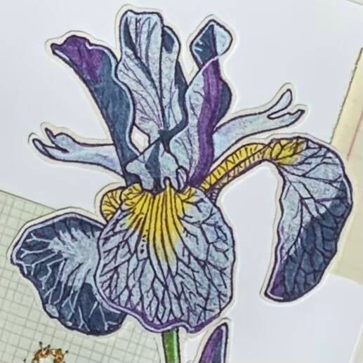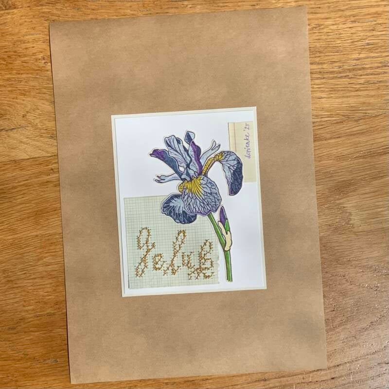 Blauwe iris | gered papier | fineliner marker potlood naaigaren | op A4 | 50,- | Contact